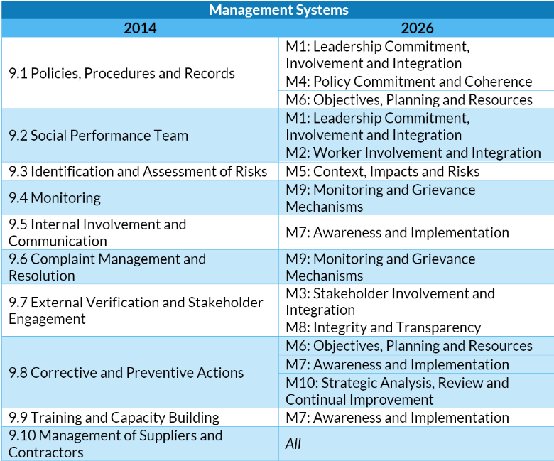 - New Management System Structure: SA8000:2014 introduced the Social Fingerprint management system structure. SA8000:2026 maintains the same elements, but has reorganized them to clearly demonstrate the steps that organizations should take in developing and implementing their system (see table below). It also makes explicit many expectations that were previously only implied or addressed through supplementary information (such as the SAI Audit Tool and SAI auditor training programs).